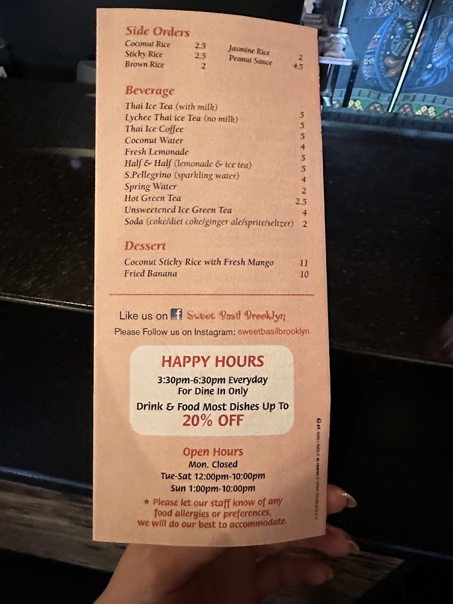Welcome to Sweet Basil - Brooklyn, a culinary gem located at 670 Franklin Ave, where vibrant flavors come alive. Specializing in authentic Thai cuisine, this eatery captivates with a well-curated menu that features enticing dishes like the Lemongrass Shrimp and the Mango Chicken. Each dish is meticulously prepared to ensure a delightful burst of flavor, such as the spicy Black Pepper Beef and the aromatic Green Curry.